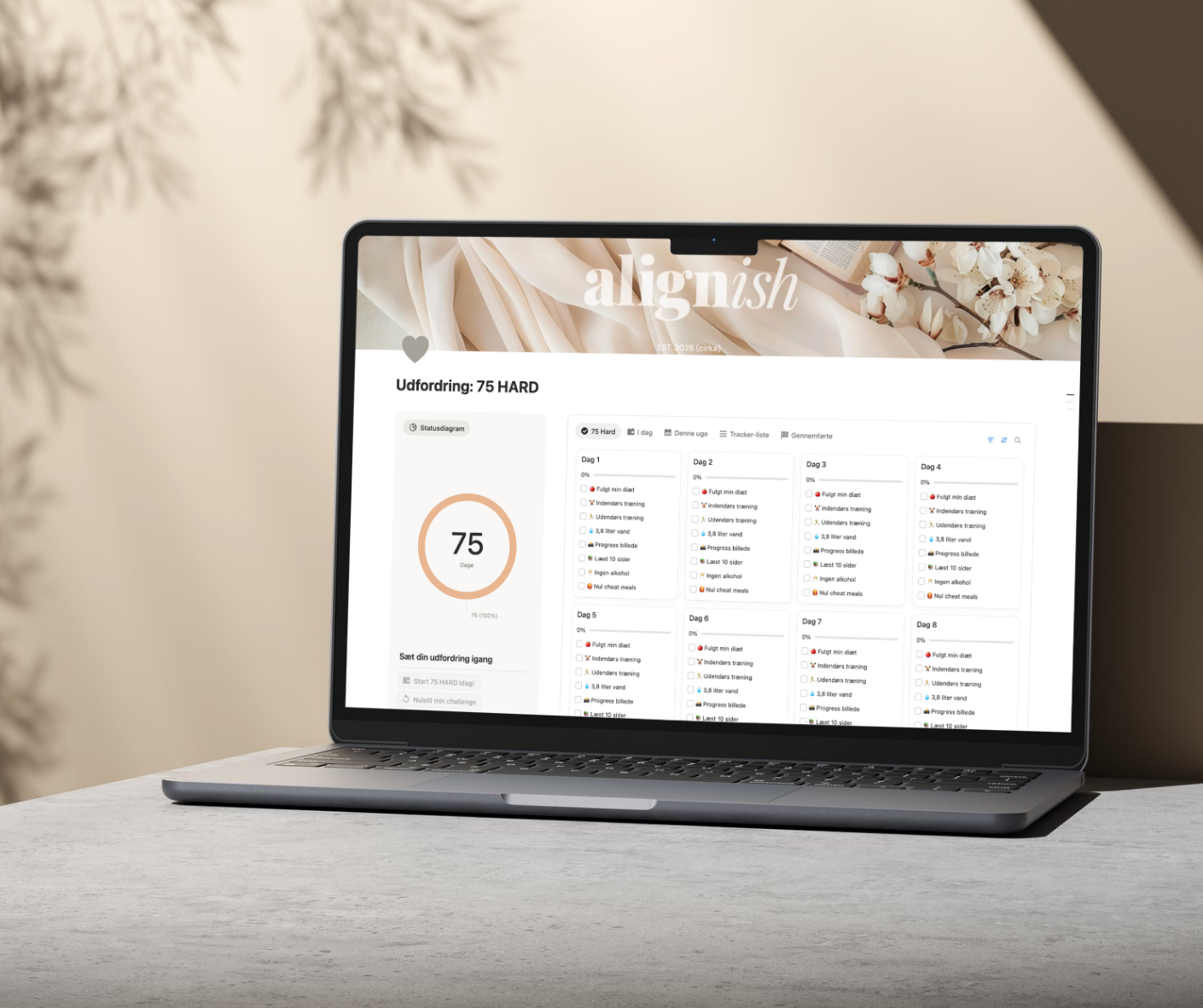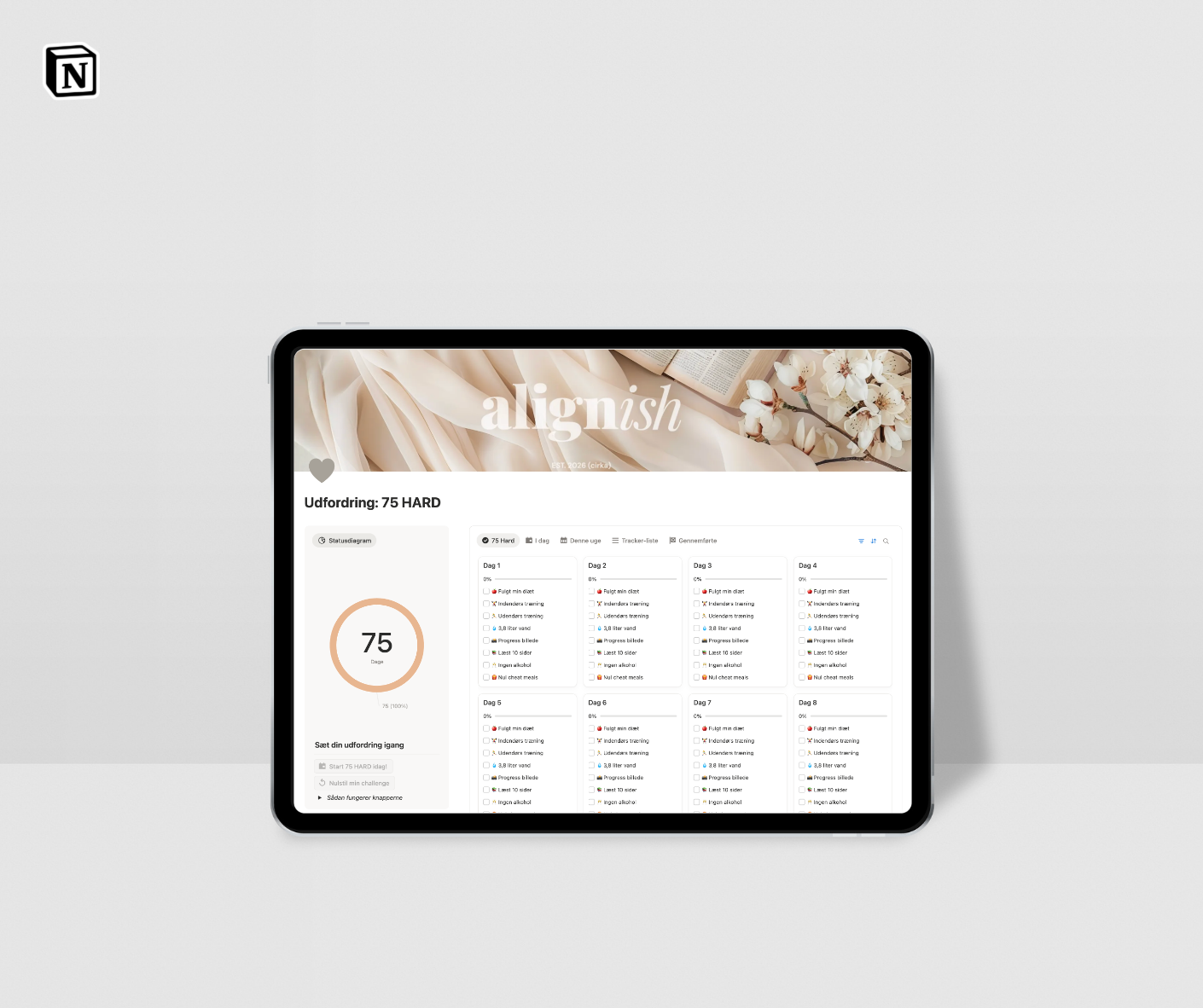 Track your 75 Hard challenge in Notion. One place for your daily check-ins and progress, so you can stay consistent without the mental load.